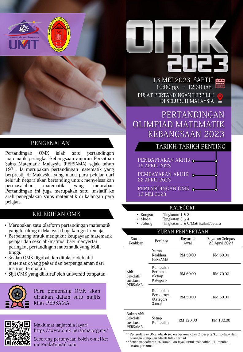 Sukacita dimaklumkan bahawa Persatuan Sains Matematik Malaysia (PERSAMA) akan menganjurkan Pertandingan OMK 2023 seperti butiran berikut: