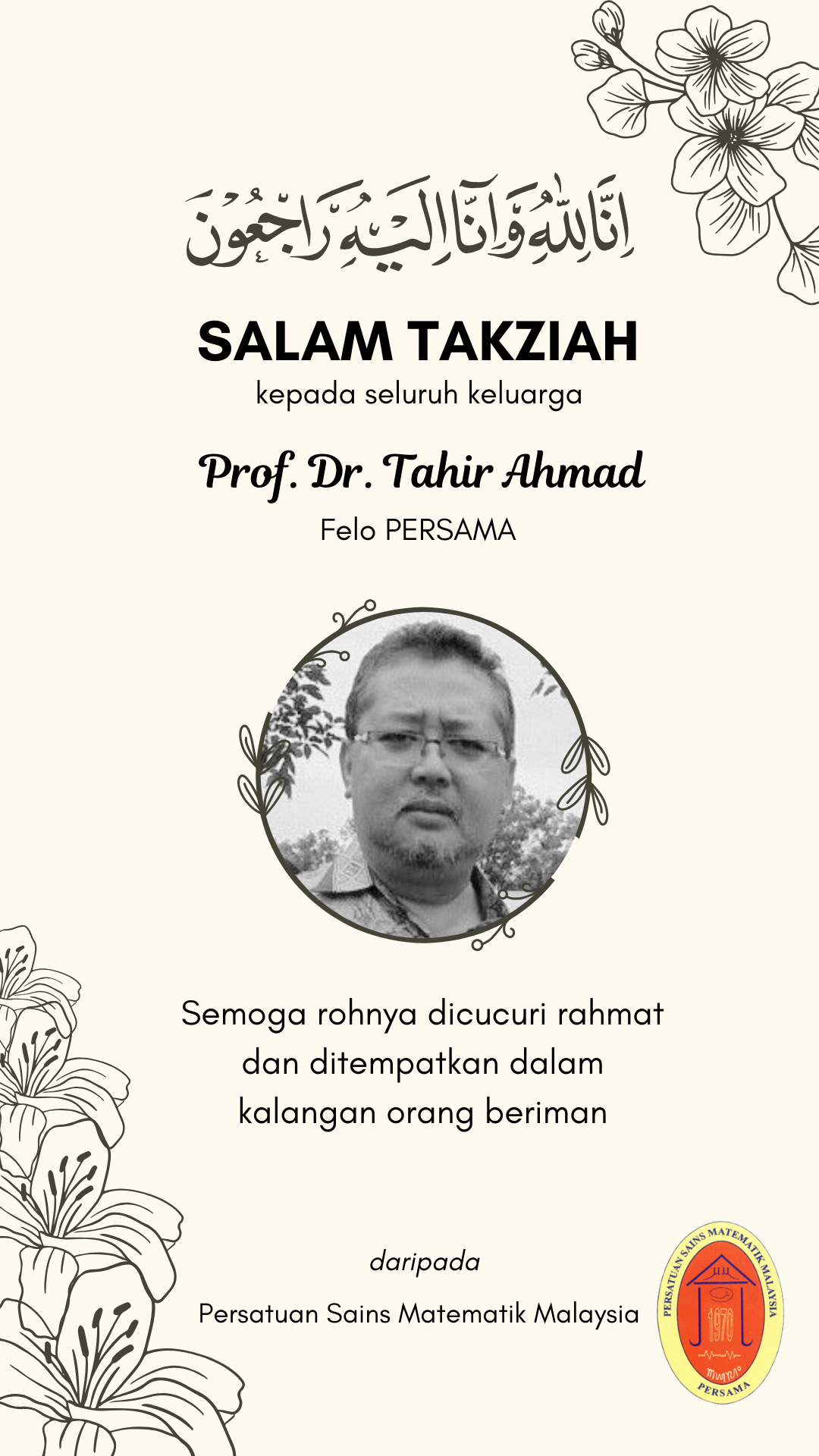 Dengan rasa dukacita, kami merakamkan ucapan takziah atas pemergian Prof. Dr. Tahir Ahmad, Felo PERSAMA dan mantan Profesor di Jabatan Sains Matematik, Fakulti Sains, UTM, yang telah kembali ke rahmatullah pada pagi 11 Februari 2026.